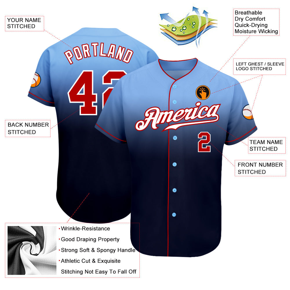 Custom Light Blue Red-Navy Authentic Fade Fashion Baseball Jersey