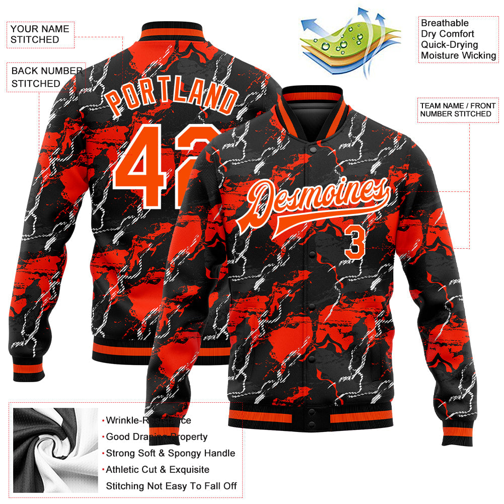 Custom Red Orange-Black 3D Pattern Design Bomber Full-Snap Varsity Letterman Jacket